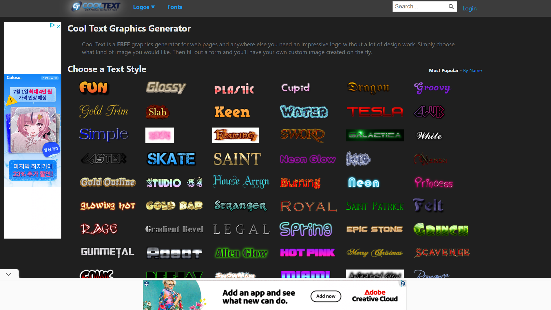 Cool Text는 타이포그래피 효과의 대표주자입니다. 복잡한 소프트웨어 없이도 클릭 몇 번만으로 멋진 텍스트 효과를 만들 수 있습니다. 3D 텍스트, 불꽃 텍스트, 얼음 텍스트 등 다양한 스타일의 텍스트 로고를 제공하며, 몇 번의 클릭만으로 텍스트를 입력하고 원하는 효과를 선택하면 바로 결과물을 확인할 수 있습니다.