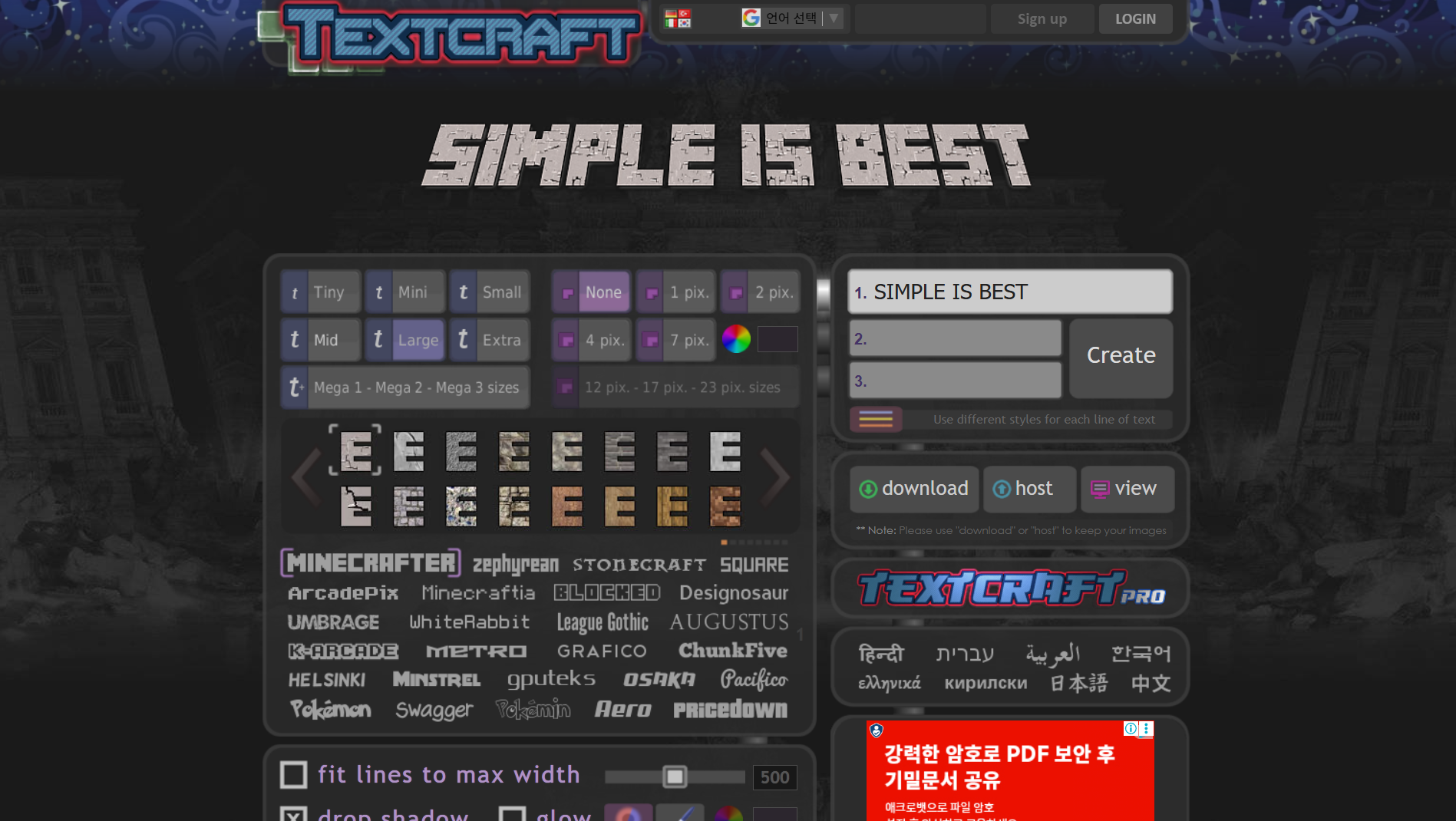 Textcraft는 특히 픽셀 아트나 마인크래프트 스타일의 텍스트를 만들고 싶은 분들에게 유용합니다. 게임 관련 콘텐츠나 레트로 감성을 담은 디자인을 할 때 이 사이트를 활용하면 독특한 분위기를 연출할 수 있어요. 글자의 재질이나 그림자 등 세부적인 설정도 가능합니다.