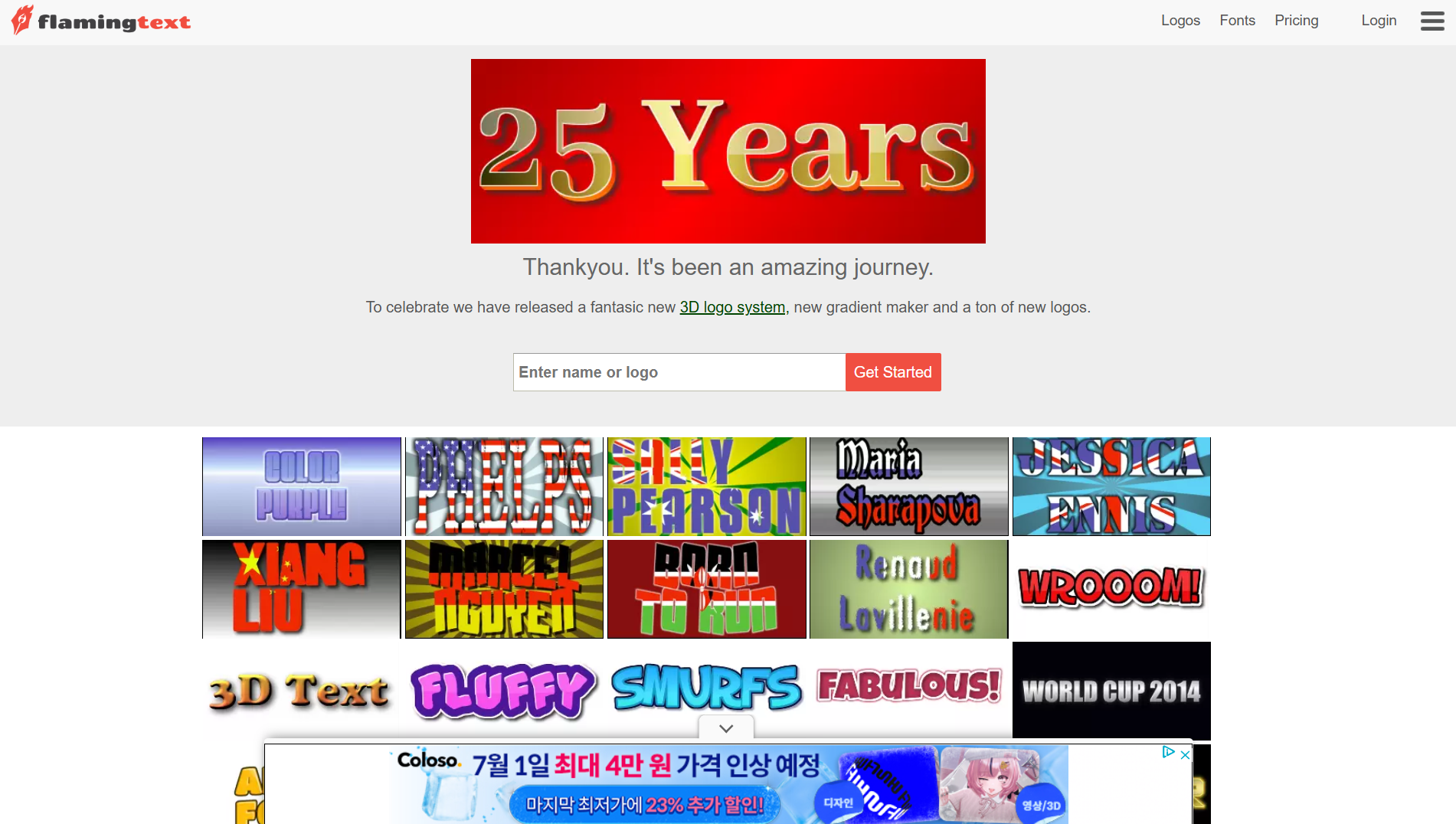 이 사이트는 불꽃, 물, 얼음 등 다양하고 방대한 텍스트 효과 스타일을 제공합니다. 3D 효과, 그라데이션, 질감 표현 등 여러 카테고리로 분류되어 있어 원하는 스타일을 쉽게 찾을 수 있고, 색상이나 크기 등도 자유롭게 조절할 수 있습니다.