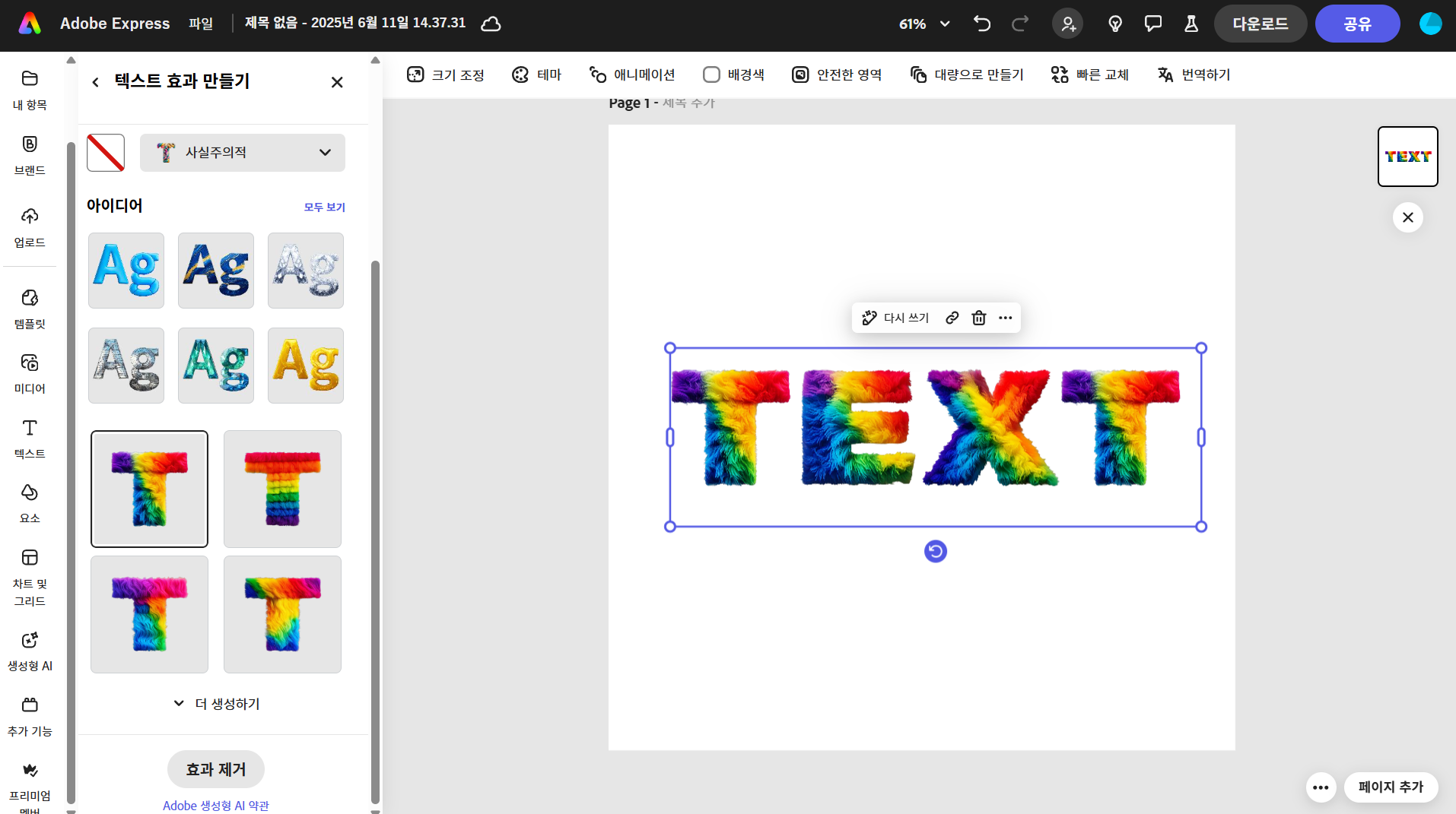 어도비의 무료 온라인 디자인 툴로, AI 기반의 혁신적인 텍스트 효과 생성 기능을 제공합니다. 단순히 텍스트 효과를 넘어서 생성형 AI 기술을 활용해 여러분이 상상하는 어떤 질감이나 스타일로든 텍스트를 변환해 줍니다. "초콜릿 텍스트", "불꽃 네온 텍스트", "털이 복슬복슬한 텍스트"처럼 구체적인 텍스트 프롬프트를 입력하기만 하면 AI가 알아서 멋진 결과물을 만들어 줘요. 디자인 초보자도 전문가처럼 개성 있는 텍스트를 만들 수 있습니다.