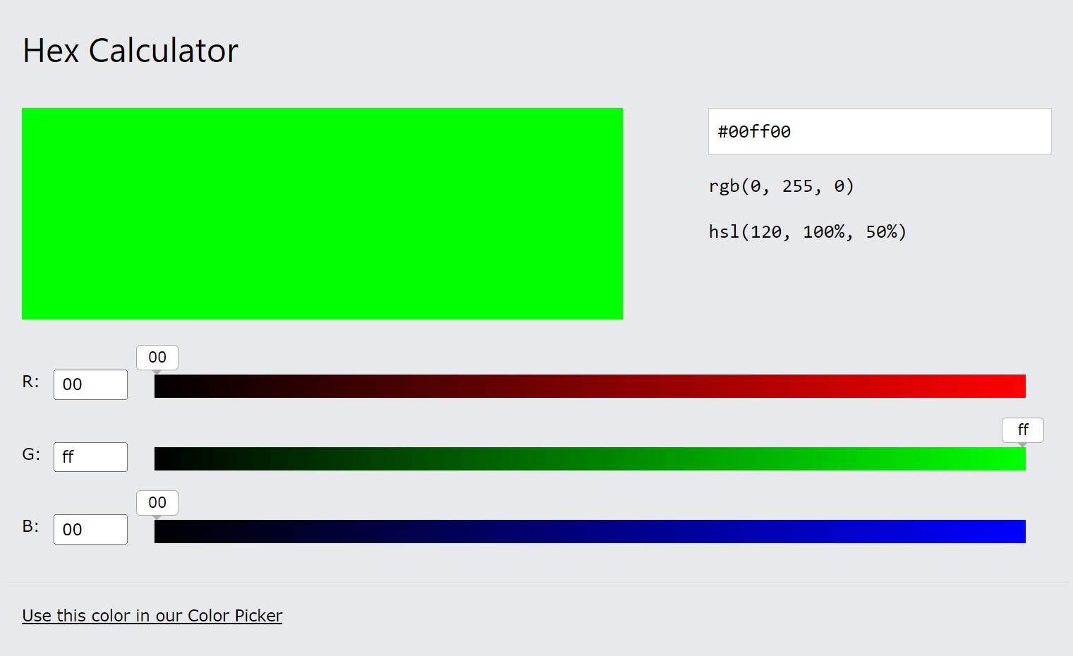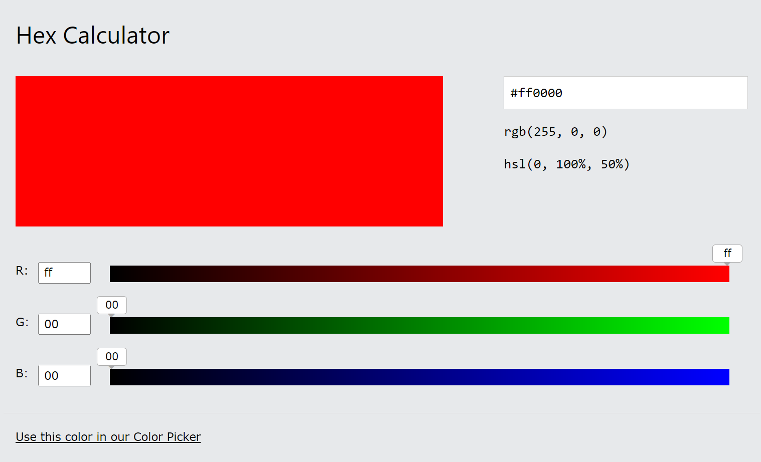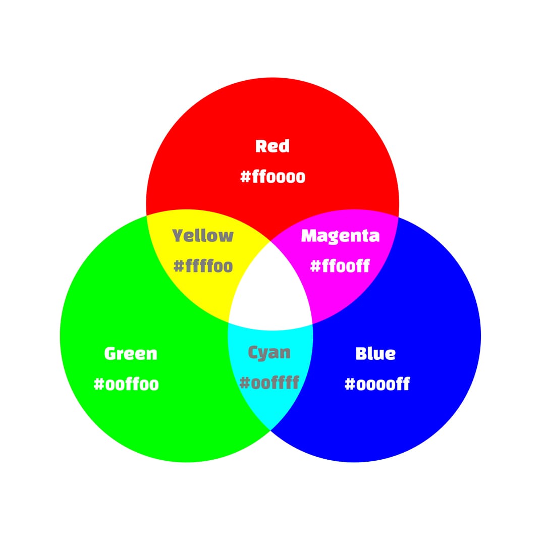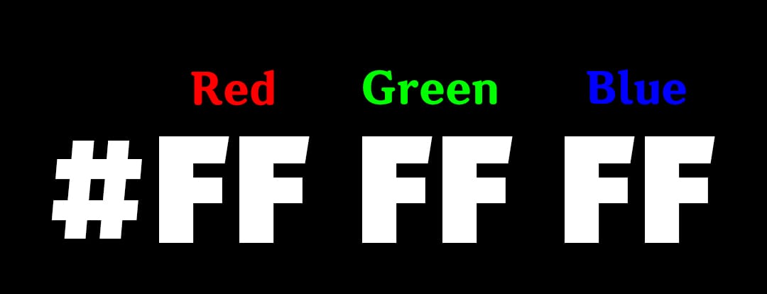 빛의 삼원색인 빨강 RED, 녹색 GREEN, 파랑 BLUE 를 모니터 화면에서 표시하기 위해서 한 채널의 두자리 십육진수가 표현할 수 있는 범위는 빛의 세기에 따라 00부터 FF까지(십진수 0에서 255까지)입니다. 즉, 하나의 채널은 256 가지의 색을 표현할 수 있으며 명도로는 00(10진수 0) 이 가장 어둡고, 중간값은 80(10진수 128), FF(10진수 255) 가 가장 밝은 명도를 가지게 됩니다.