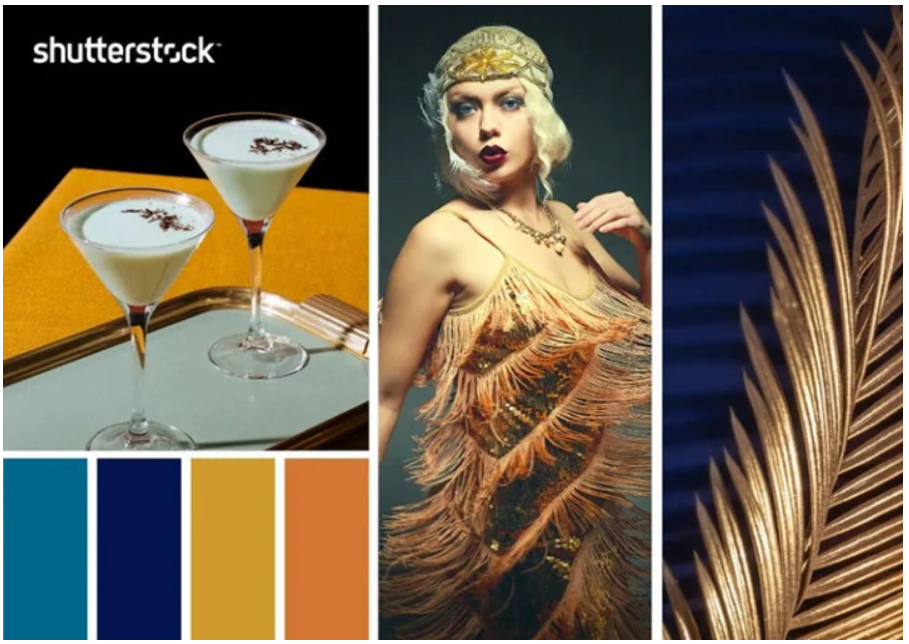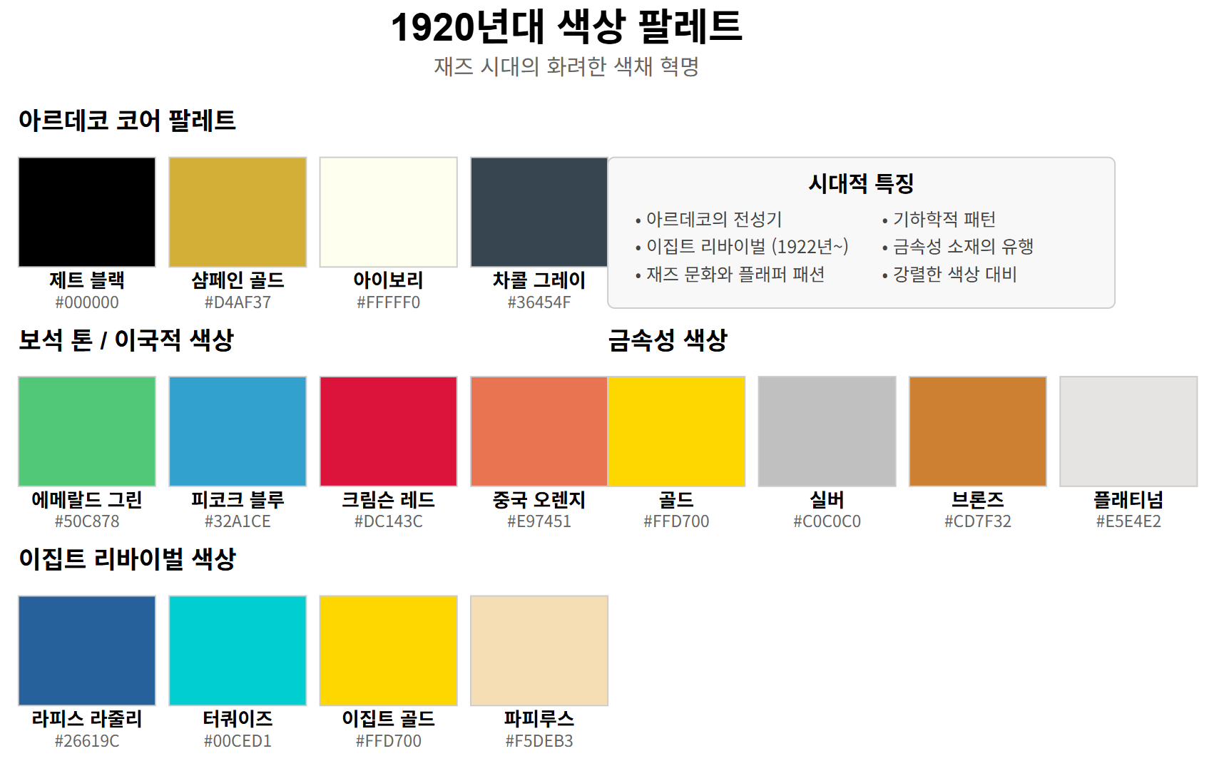 1922년 투탕카멘 왕 무덤 발견은 색상 팔레트에 또 다른 차원을 더했으며, 라피스 라줄리 블루, 터쿼이즈, 골드 등 이집트 풍의 색상이 아르데코의 기하학적 패턴과 결합되어 더욱 이국적이고 신비로운 분위기를 연출했습니다. 삼각형, 지그재그, 썬버스트 모티브와 같은 대담한 패턴들은 플래티넘, 실버, 브론즈 같은 금속성 색상과 만나 시대를 대표하는 디자인 언어를 형성했고, 미드나잇 블루와 샴페인 골드의 조합은 재즈 클럽의 화려한 밤문화를 상징했습니다. 1920년대의 색상 팔레트는 간결하면서도 화려하고 대담한 형태로 남아 현대의 인테리어, 패션, 그래픽 디자인에 여전히 많은 영감을 주고 있으며, 특히 금속성 색상과 강렬한 원색의 조합은 시대를 초월한 세련미의 전형이 되었습니다.