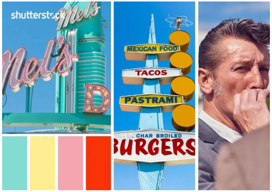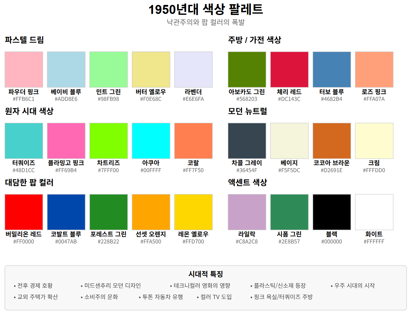 1950년대 색상 팔레트는 파우더 핑크, 베이비 블루, 버터 옐로우 같은 부드러운 파스텔 톤과 버밀리온 레드, 코발트 블루, 포레스트 그린 같은 대담한 원색이 기하학적 패턴과 결합되어 현대적이고 역동적인 분위기를 연출했습니다. 교외 주택가의 확산과 텔레비전의 보급은 가정 내 컬러 인테리어의 대중화를 이끌었고, 특히 핑크 욕실과 터쿼이즈 주방, 투톤 자동차는 이 시대의 아이콘이 되었으며, 차콜 그레이와 크림 같은 모던 뉴트럴 색상은 도시적 세련미를 더했습니다. 이러한 색상의 다양성은 전쟁 후 심리적 안정 추구와 미국의 번영이라는 사회적 배경 속에서 소비주의 마케팅 전략과 함께 발전했고, 현재까지도 레트로 디자인의 핵심 요소로 사랑받고 있습니다.