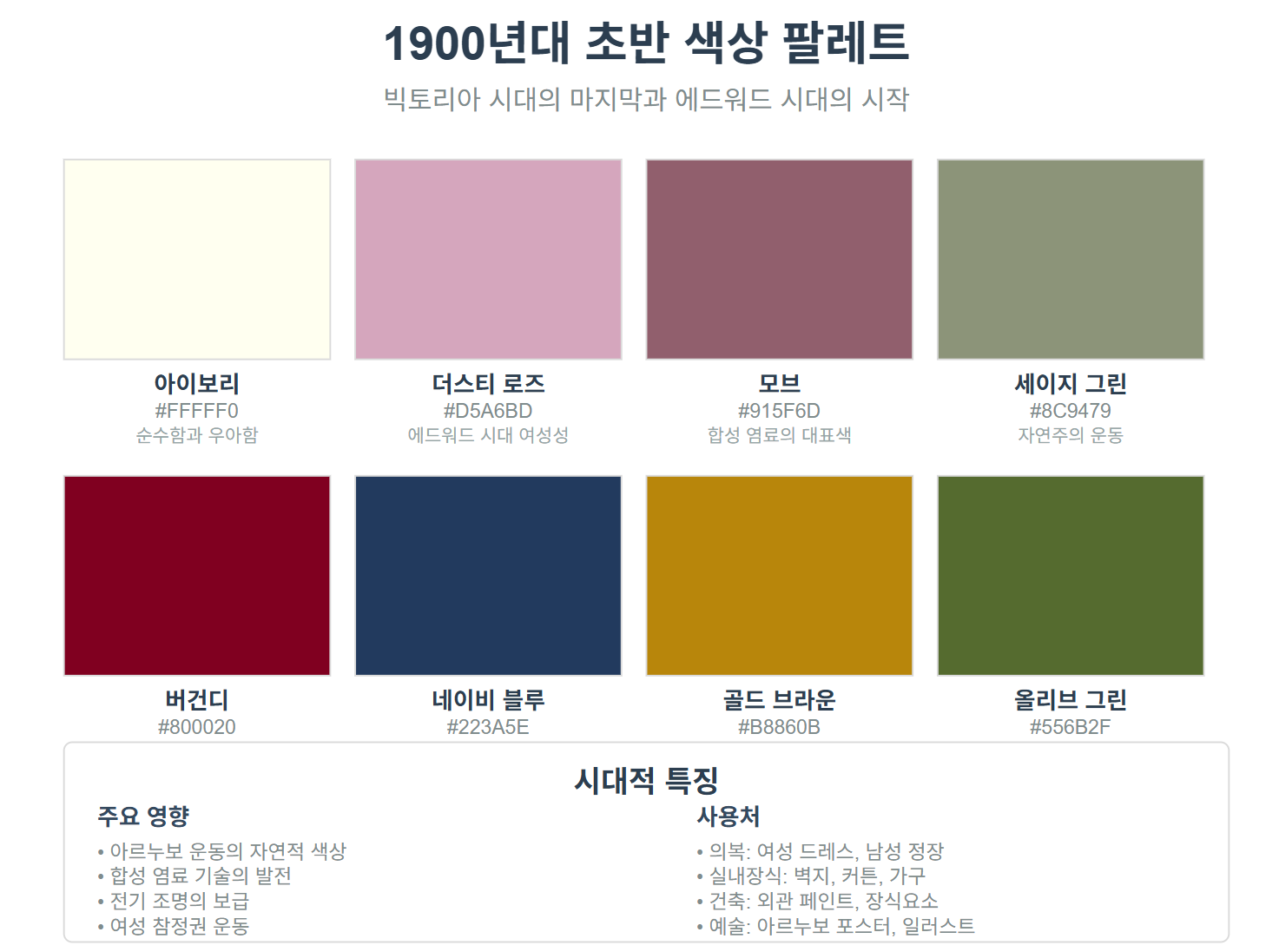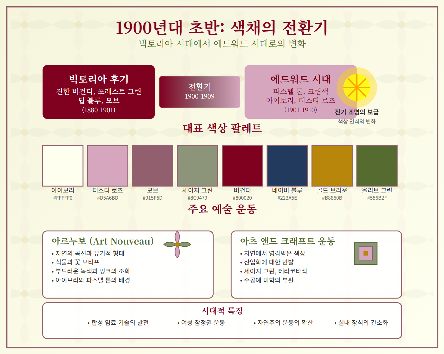 1900년대 초반은 빅토리아 시대가 막을 내리고 에드워드 시대가 시작되는 색채의 전환기로, 19세기의 화려함에서 20세기의 세련됨으로 이행하는 과도기적 특징을 보여줍니다. 빅토리아 후기의 영향은 진한 버건디, 포레스트 그린 같은 깊은 색상에서 점차 부드러운 파스텔 톤으로 변화했으며, 특히 로맨틱한 더스티 로즈, 크림색, 모브(Mauve) 같은 색상이 여성복과 실내장식에 널리 사용되었습니다. 이 시기에는 1856년 합성 염료 발명 이후 지속된 모브의 인기와 함께, 아이보리와 크림색이 순수함과 우아함의 상징으로 자리잡았고, 네이비 블루는 남성복의 기본색으로 확립되었습니다.