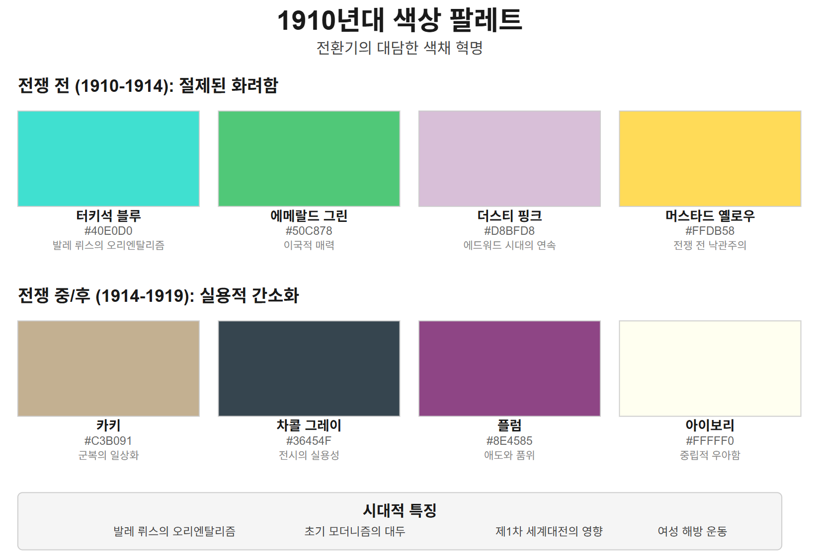 이 시기의 색상 팔레트는 단순한 시각적 요소를 넘어 산업화와 자연, 전통과 혁신 사이의 균형을 모색했던 시대정신을 반영합니다. 전쟁이라는 비극적 현실과 모더니즘이라는 진보적 이상이 공존하며, 골드, 실버, 브론즈 같은 금속적 요소가 산업 시대의 세련됨을 상징하는 동시에 다크 슬레이트와 차콜 그레이는 전시의 엄숙함을 나타냈습니다. 특히 러시아 발레단이 가져온 오리엔탈리즘의 화려한 색채가 전쟁의 어두운 현실과 대비를 이루며, 수공예의 따뜻함과 대량생산의 차가움 사이의 긴장감을 색채로 표현한 이 시대의 팔레트는 20세기 디자인 혁명의 중요한 문화적 유산이 되었습니다.
