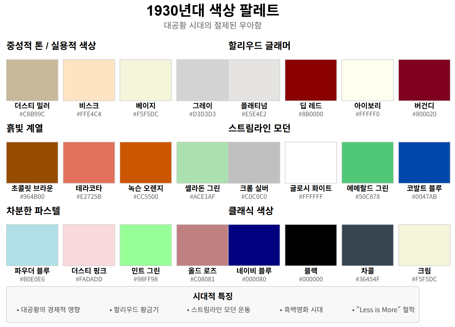 1930년대는 대공황의 경제적 어려움 속에서도 실용성과 품위를 동시에 추구한 시기로, 1920년대의 화려함은 사라지고 베이지, 크림, 그레이 같은 중성적 톤과 브라운, 테라코타, 녹슨 오렌지 등의 흙빛 계열이 주류를 이루었습니다. 이러한 실용적 색상들은 파우더 블루, 더스티 핑크, 민트 그린 같은 차분한 파스텔과 조화를 이루며 경제적 현실을 반영하면서도 세련됨을 잃지 않았고, 특히 더스티 밀러, 비스크, 셀라돈 그린 같은 은은한 색상들이 시대의 절제미를 대표했습니다. 동시에 할리우드 황금기의 영향으로 플래티넘 블론드, 딥 레드, 아이보리 새틴 같은 글래머러스한 색상들이 스크린을 통해 대중의 미적 감각에 영향을 미쳤습니다.