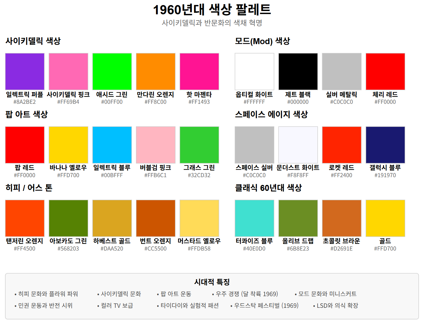 1960년대는 베이비붐 세대의 등장과 반문화 운동이 만들어낸 전례 없는 색채 혁명의 시기로, 사이키델릭 문화와 히피 운동의 영향으로 일렉트릭 퍼플, 애시드 그린, 핫 마젠타 같은 형광색이 대담하게 사용되었습니다. 팝 아트 운동은 앤디 워홀의 캠벨 수프 캔의 빨강과 바나나 옐로우 같은 상업적 색상을 예술로 승화시켰고, 모드 문화는 옵티컬 화이트와 제트 블랙의 기하학적 패턴으로 현대적 감각을 표현했으며, 특히 탠저린 오렌지, 사이키델릭 핑크, 번트 오렌지 등의 강렬한 색상 조합은 시각적 충격과 함께 자유로운 정신을 상징했습니다.
