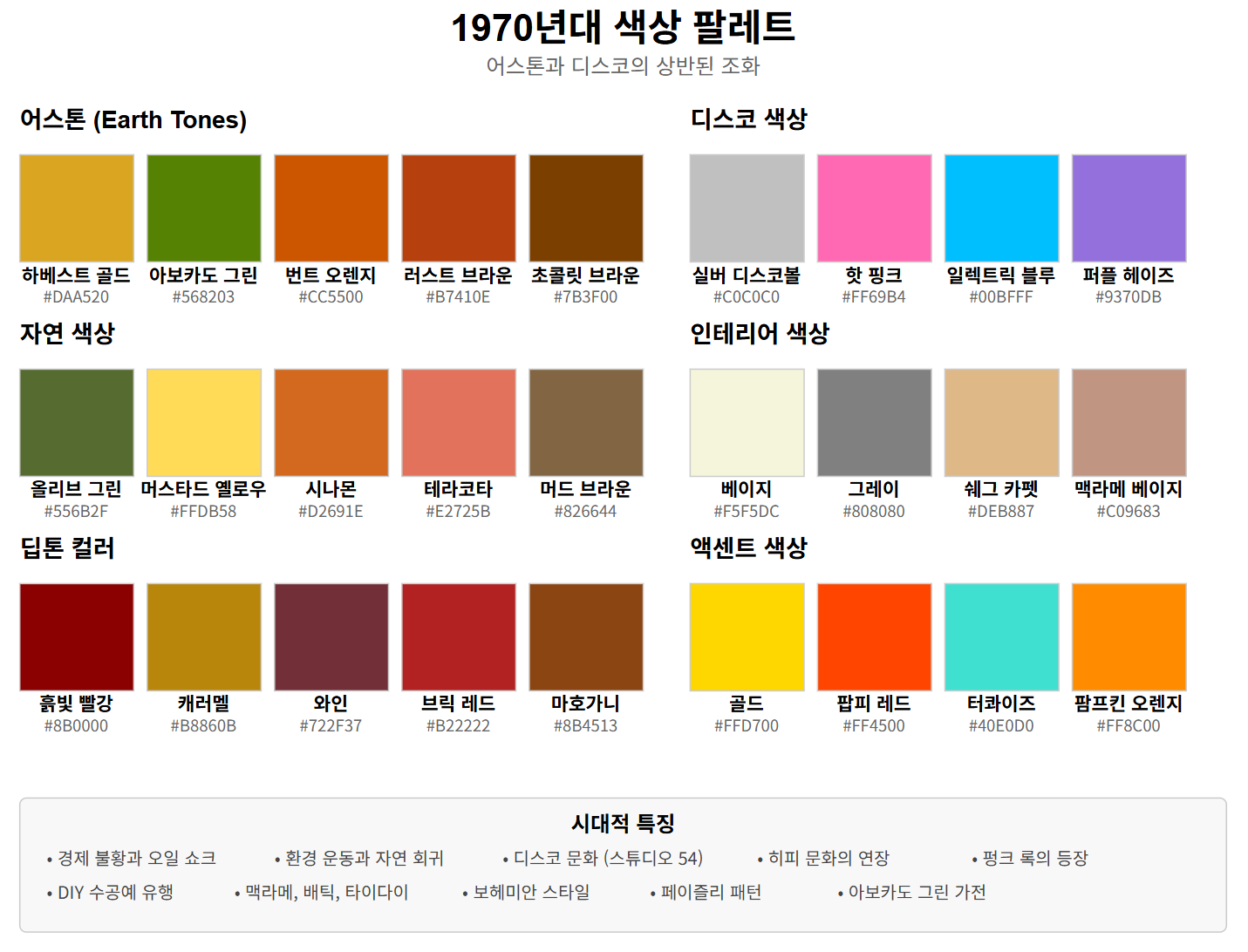 1970년대 색상 팔레트는 흙빛 빨강, 올리브 그린, 머스타드 옐로우, 초콜릿 브라운 같은 자연에서 영감받은 딥톤 색상과 베이지, 그레이 같은 중성색의 조합이 특징적이었으며, 맥라메, 배틱, 타이다이 등 DIY 수공예의 유행과 함께 시나몬, 테라코타, 머드 브라운 같은 유기적인 색상이 선호되었습니다. 페이즐리 패턴과 기하학적 무늬에 사용된 이러한 색상들은 불경기 시대의 실용성과 소박함을 추구하면서도 보헤미안 스타일의 자유로움을 표현했고, 현재까지도 빈티지 패션과 레트로 인테리어에서 재해석되어 사랑받고 있으며, 특히 밝은 톤의 소재나 미니멀한 디자인과 결합할 때 현대적 감각을 더할 수 있습니다.