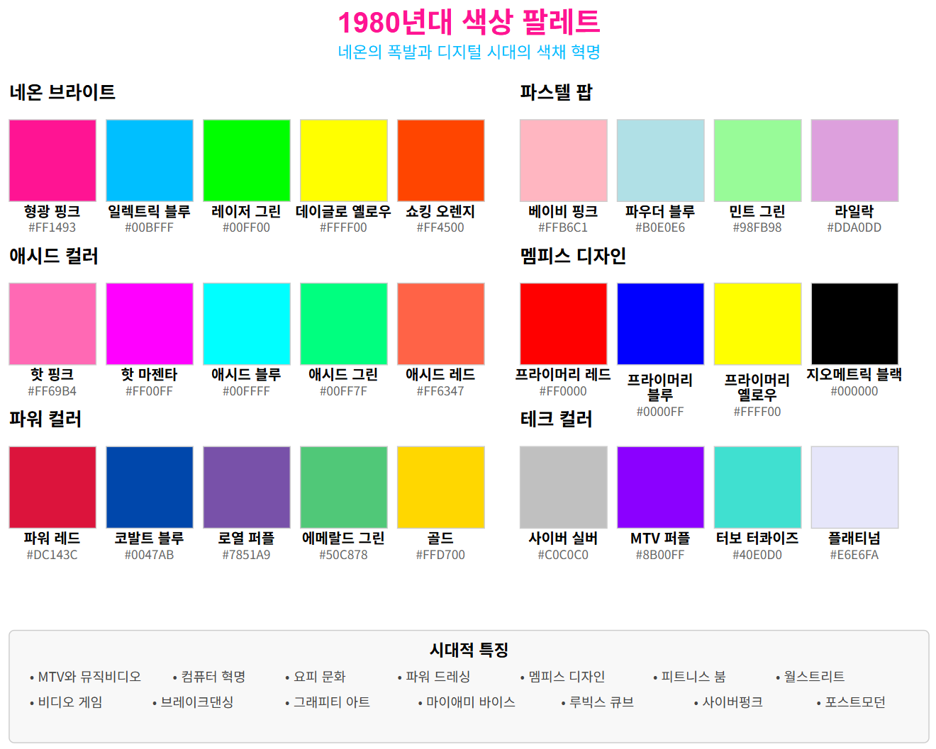 1980년대는 블루와 그린, 레드와 오렌지 사이를 오가는 애시드 컬러가 런웨이와 스트리트 패션을 지배했고, 형광 메이크업과 네온 아이라이너가 뷰티 트렌드를 이끌었으며, 멤피스 디자인 그룹의 영향으로 프라이머리 컬러의 기하학적 패턴과 테라조 핑크 같은 포스트모던 색상이 인테리어와 그래픽 디자인에 혁명을 일으켰습니다. 요피 문화와 월스트리트의 영향으로 골드, 플래티넘, 에메랄드 그린 같은 부와 성공을 상징하는 색상이 유행했고, 루빅스 큐브의 멀티컬러와 힙합 문화의 그래피티 아트는 대담한 색상 조합의 새로운 가능성을 열었으며, 이러한 비비드한 색상들은 오늘날까지도 80년대의 향수와 레트로 감성을 불러일으키는 중요한 요소가 되고 있습니다.