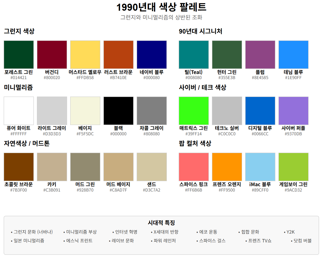 1990년대 후반 인터넷 혁명과 Y2K 시대를 맞아 매트릭스 그린, 디지털 블루, 사이버 퍼플 같은 테크놀로지 색상이 등장했고, 파워 레인저의 원색들, 스파이스 걸스의 생동감 있는 색상, iMac의 반투명 캔디 컬러가 팝 문화를 통해 확산되었습니다. 머드 톤의 회색빛 그린과 베이지 같은 차분한 중성색은 일본 미니멀리즘의 영향을 받아 고급스러움을 표현했고, 에스닉 프린트와 70-80년대 복고풍 액센트가 포인트로 활용되면서 다문화주의 시대의 다양성을 반영했으며, 이러한 90년대의 색상 팔레트는 실용성과 감성, 기술과 자연의 균형을 추구하는 현대 디자인 트렌드의 기초가 되었습니다.