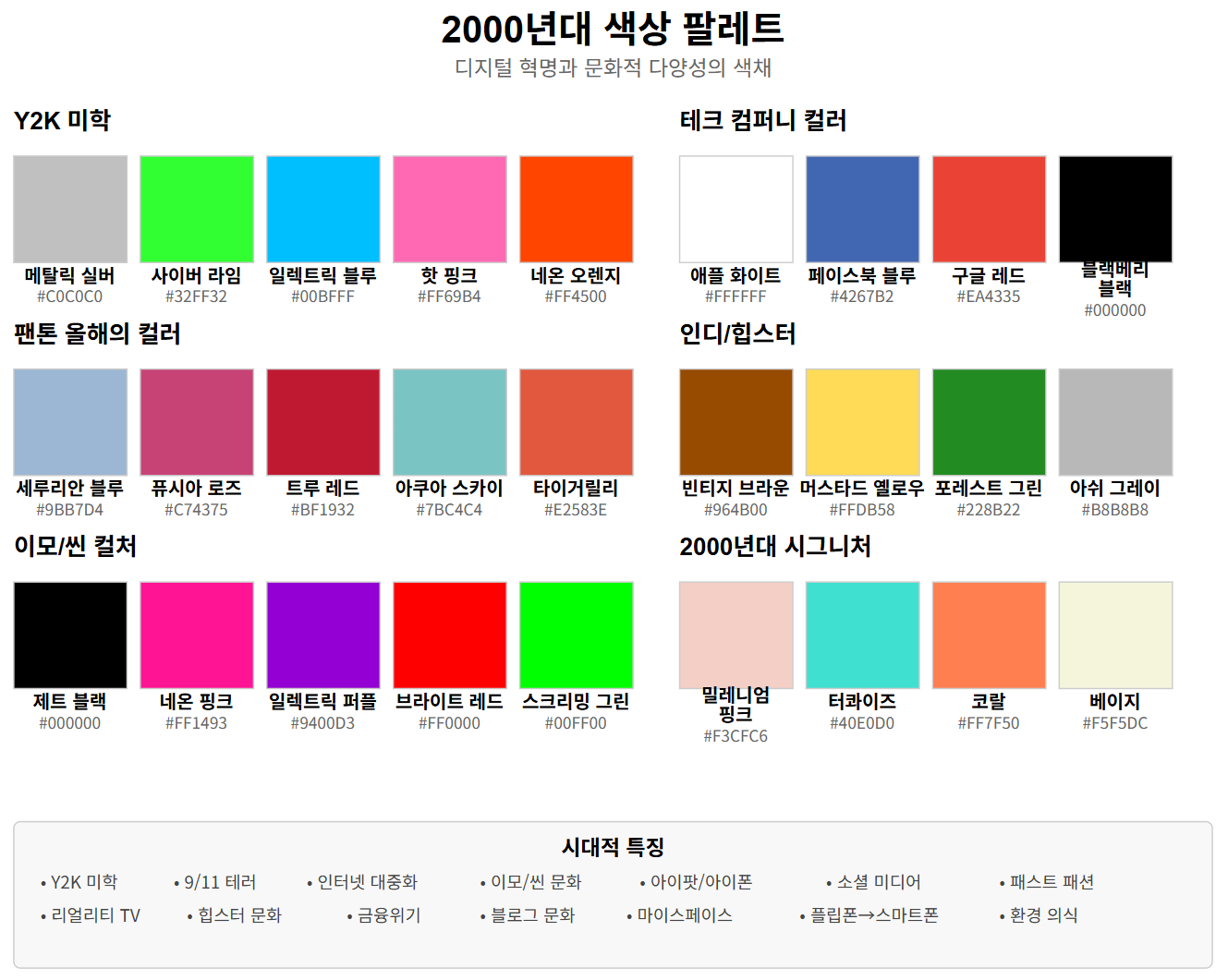 2000년대는 인터넷의 대중화와 디지털 기술의 급격한 발전으로 Y2K 미학의 메탈릭 실버, 홀로그래픽, 사이버 라임 같은 미래지향적 색상과 세루리안 블루(2000), 퓨시아 로즈(2001), 트루 레드(2002) 등 팬톤이 선정한 올해의 컬러가 시대정신을 반영했습니다. 9/11 테러 이후의 불안정한 세계 정세 속에서도 디지털 시대의 낙관주의는 애플 화이트, 구글의 원색 조합, 페이스북 블루 같은 테크 기업들의 브랜드 컬러로 표현되었고, 동시에 이모/씬 문화는 제트 블랙과 네온 핑크의 극단적 대비로 젊은 세대의 자기표현 욕구를 드러냈습니다.