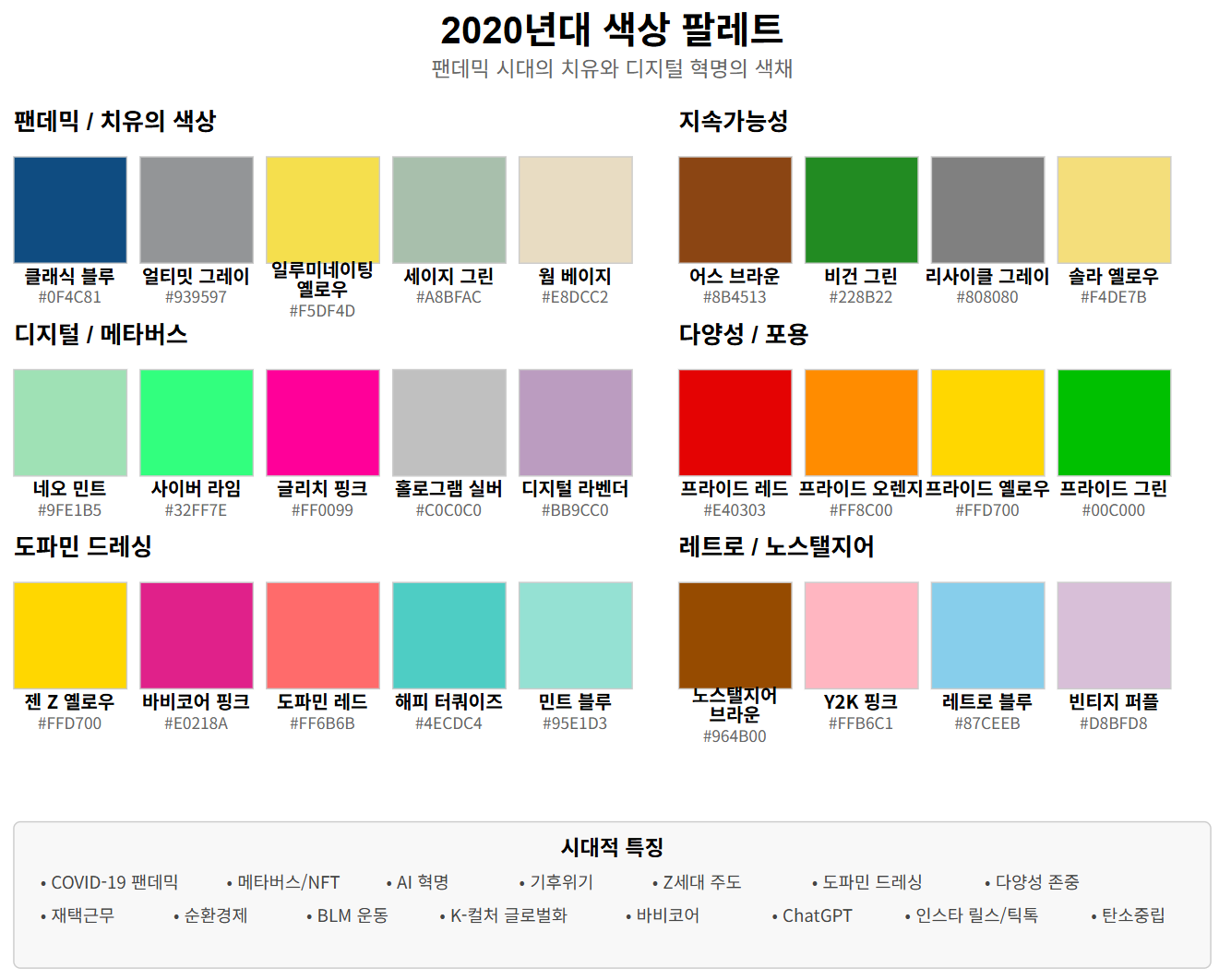 2020년대는 COVID-19 팬데믹과 함께 시작되어 디지털 메타버스의 급속한 성장이 이루어진 시대로, 팬톤이 선정한 2020년 클래식 블루는 불안한 시기의 안정성과 신뢰를 상징했고, 2021년 얼티밋 그레이와 일루미네이팅 옐로우는 견고함과 희망의 조화를 표현했습니다. 집콕 생활과 재택근무의 일상화로 세이지 그린, 웜 베이지 같은 자연 친화적 어스톤이 편안함과 치유를 제공했으며, WGSN이 선정한 네오 민트는 과학기술과 자연의 조화를 반영하면서 Z세대의 디지털 네이티브 감성과 메타버스 시대의 사이버 라임, 글리치 핑크, 홀로그램 실버 같은 미래적 색상들이 가상과 현실의 경계를 허물었습니다.
