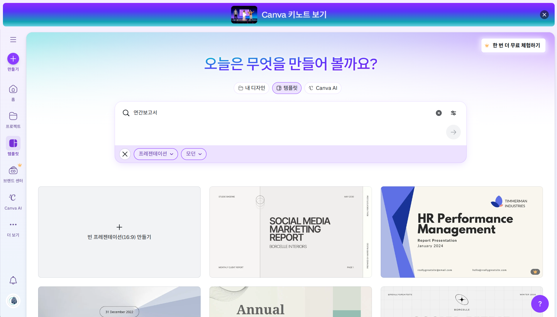 - 캔바 홈 → ‘템플릿’ 검색창에 'Business Report' , 'Annual Report', ‘연간보고서’, ‘연말보고서’ 검색