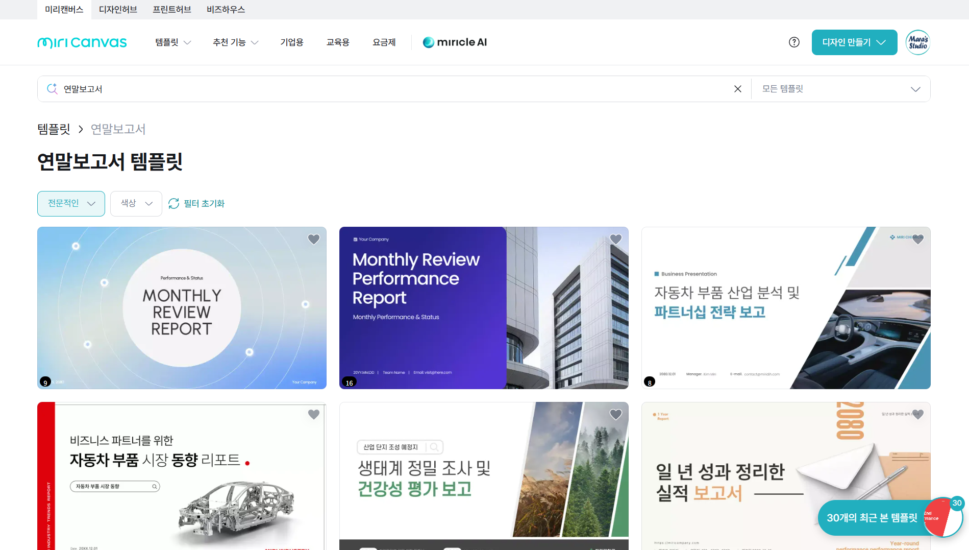 - 미리캔버스 메인 페이지 → 템플릿 검색창에 '연말 보고서 , '보고서', '비즈니스 리포트' 입력