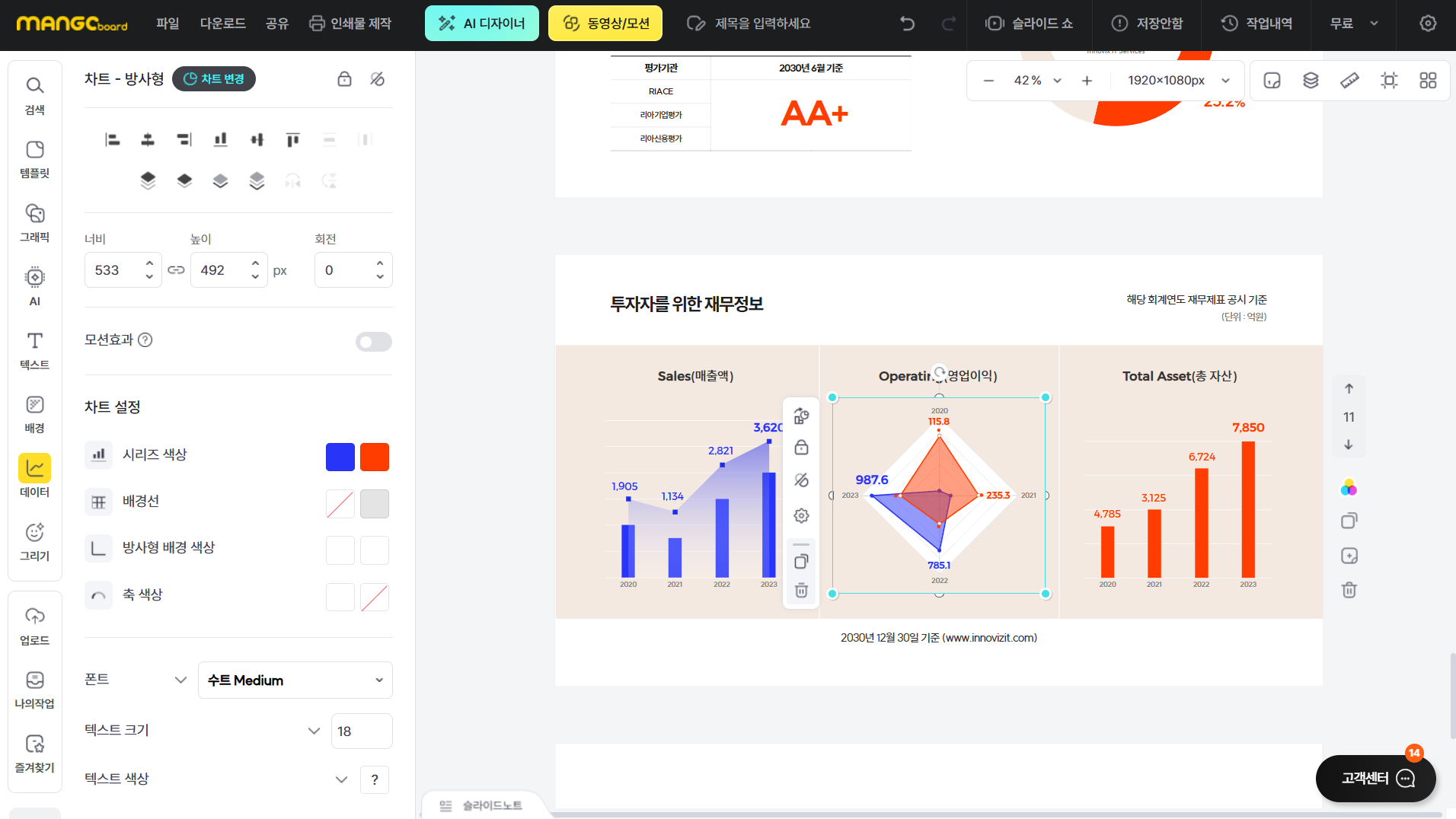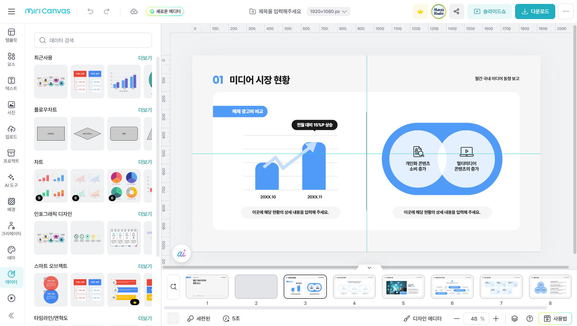 - 활용도 높은 차트와 인포그래픽 요소를 사용하여 빠르게 작업 가능