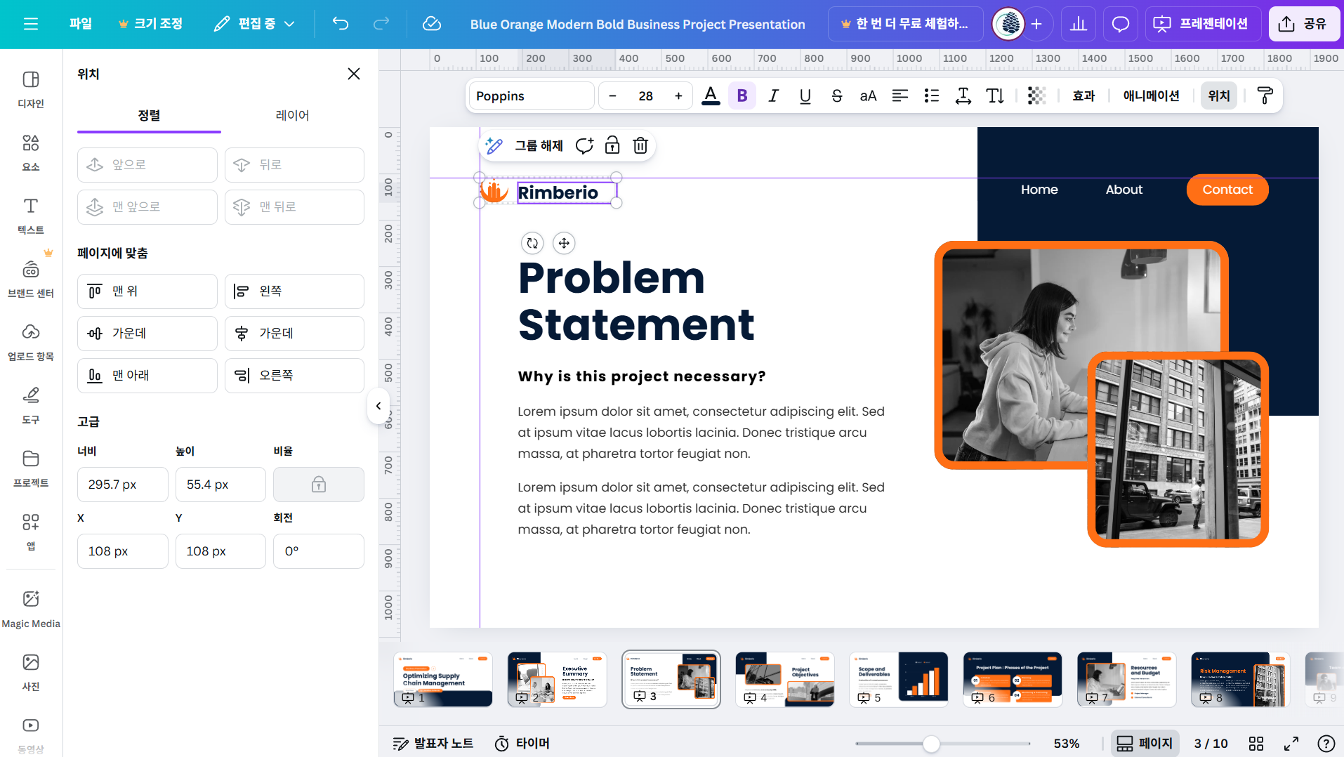 - 그룹화 (Grouping): 반복 요소가 여러 개(예: 로고 + 구분선)라면, 이 요소들을 하나로 그룹화한 후 복사-붙여넣기(Ctrl+C, Ctrl+V)를 하면 개별 요소의 위치가 틀어지는 것을 방지할 수 있습니다.