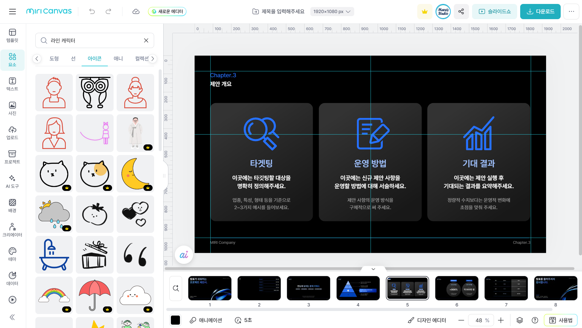 - 미리캔버스: 좌측메뉴 ‘요소’→상단 ‘아이콘’버튼 → ‘라인 캐릭터’ 검색 (라인 캐릭터 아이콘)