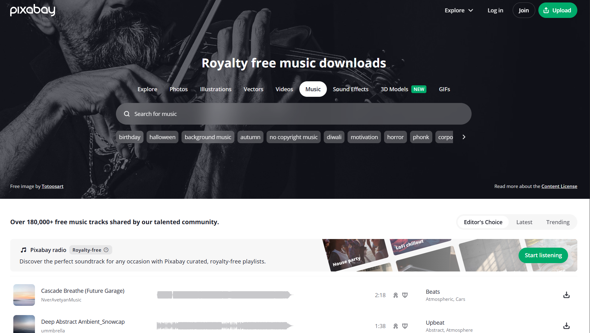 - Pixabay Music : 무료 사진, 비디오뿐만 아니라 다양한 고품질의 저작권 무료 음원과 효과음을 제공하는 인기 있는 온라인 플랫폼입니다.