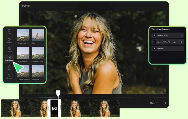 - 전환 효과(Transition): 너무 과하지 않게 컷 사이에 자연스러운 흐름을 만들어 줍니다. 페이드 인/아웃, 슬라이드 효과만으로도 영상이 훨씬 매끄러워 집니다. 컷 전환이 잦은 영상에서는 화려한 트랜지션을 피하고, 3가지 이하의 단순한 전환 효과만 반복 사용하는 것이 전문적으로 보입니다.