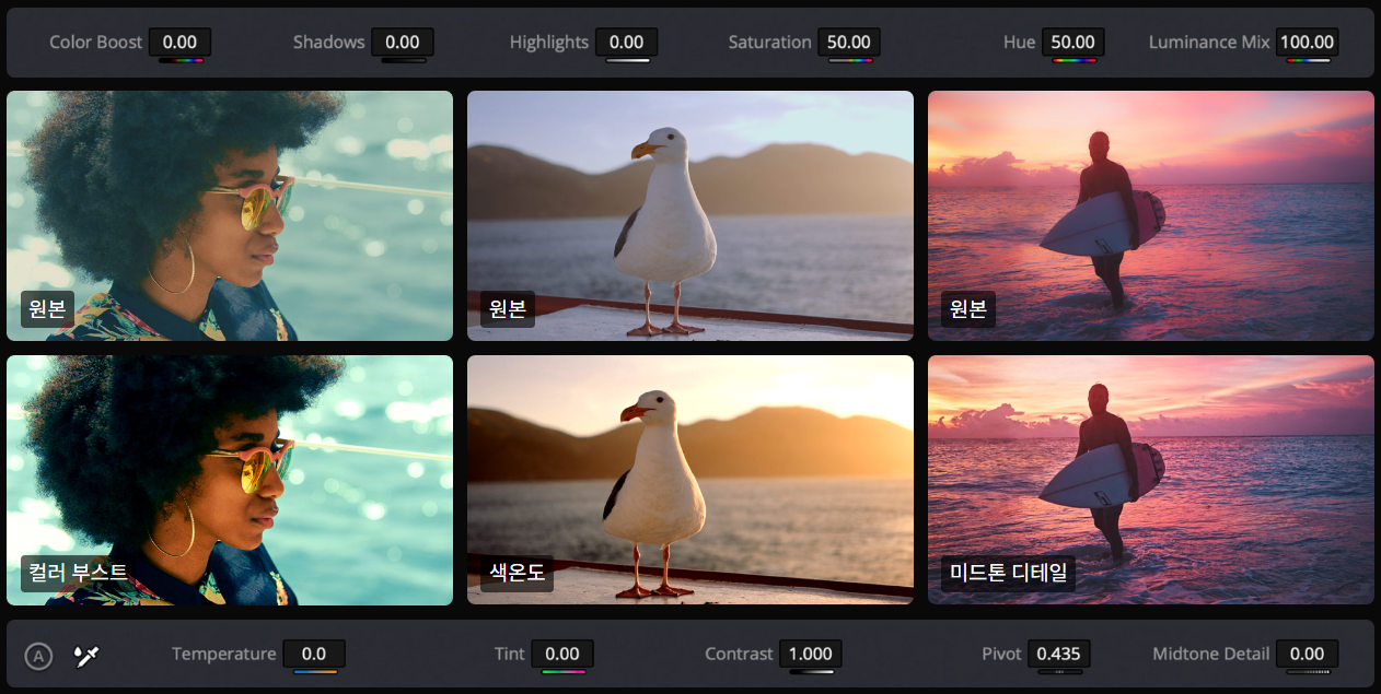 - 채도(Saturation) : 색이 너무 튀면 오히려 거슬립니다. 자연스러운 색감을 유지하는 것이 포인트입니다.색이 과하게 튀지 않도록 채도를 5~10 정도 살짝 낮춰 자연스러운 색감을 유지합니다. CapCut, DaVinci Resolve 에서는 색보정 프리셋(LUT)을 불러와 한 번의 클릭으로 전체 영상 색감을 통일할 수 있어요.